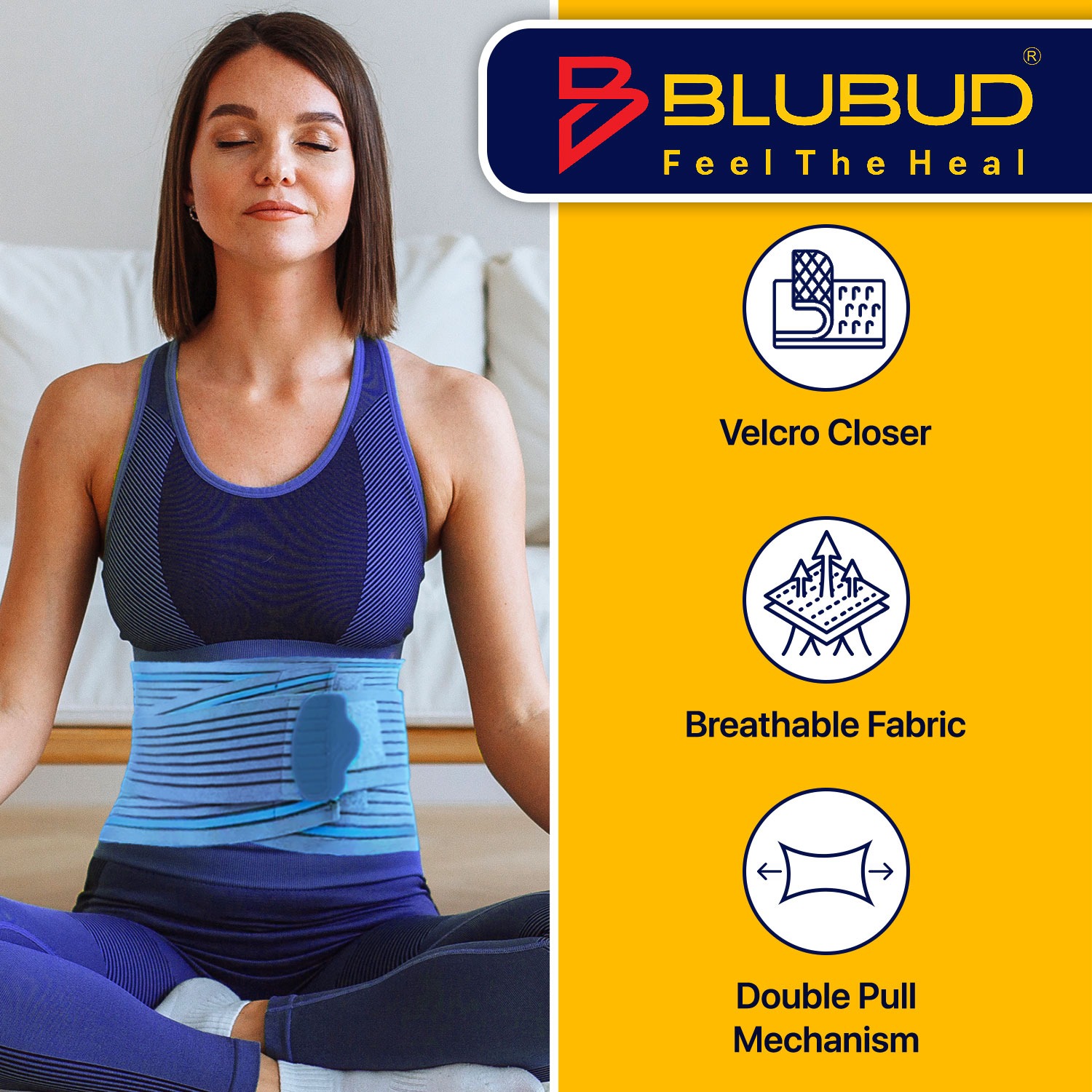 he BLUBUD Lumbo Sacral Back Support Belt is specially designed to provide firm compression and stabilization to the lower back (lumbar region). It supports the spine, reduces strain, and helps relieve lower back pain caused by muscle fatigue, poor posture, prolonged sitting, or physical exertion.