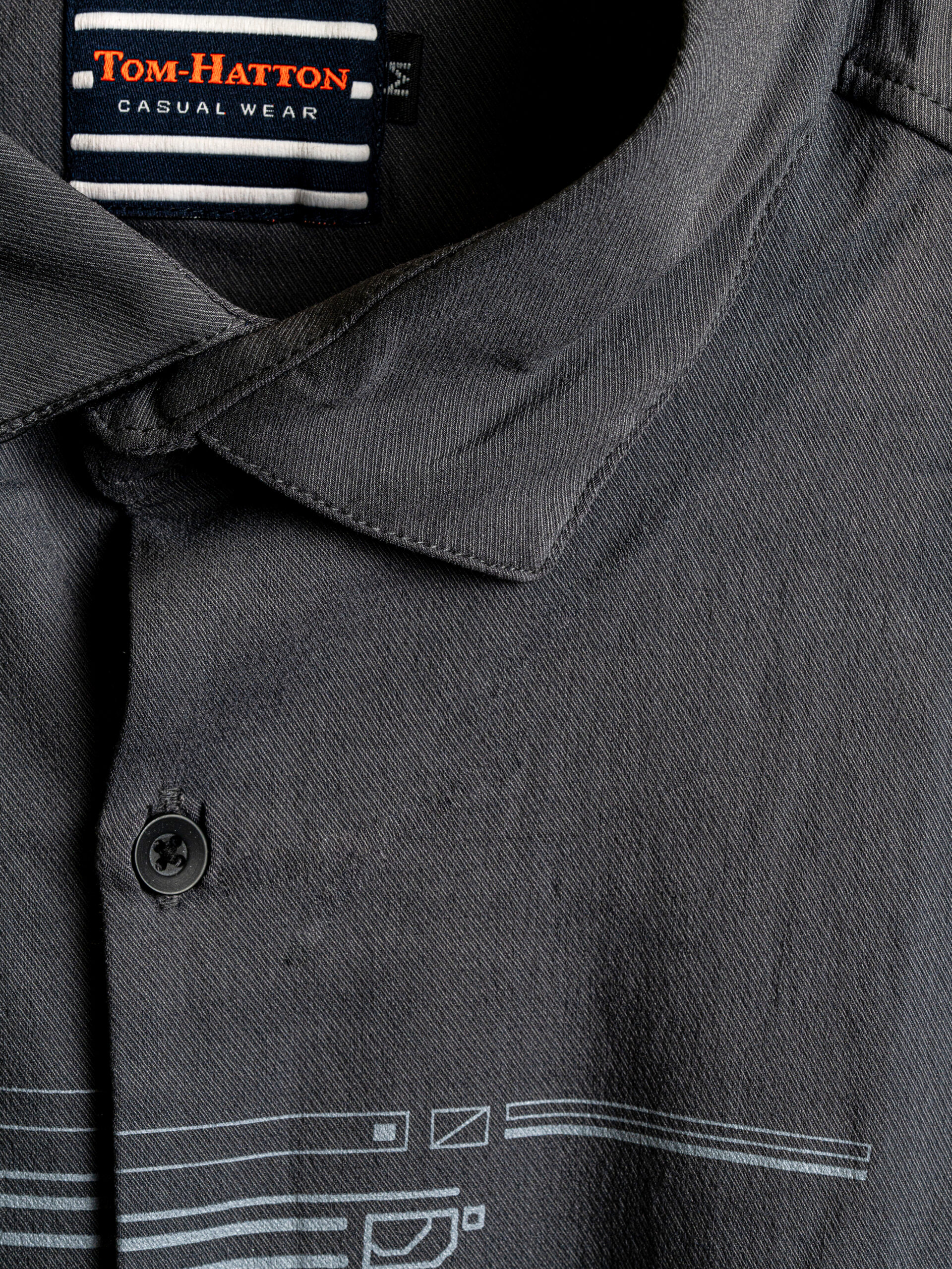 A stylish charcoal grey casual shirt featuring a modern graphic print and a soft textured fabric. Designed for everyday comfort with a bold, contemporary edge.