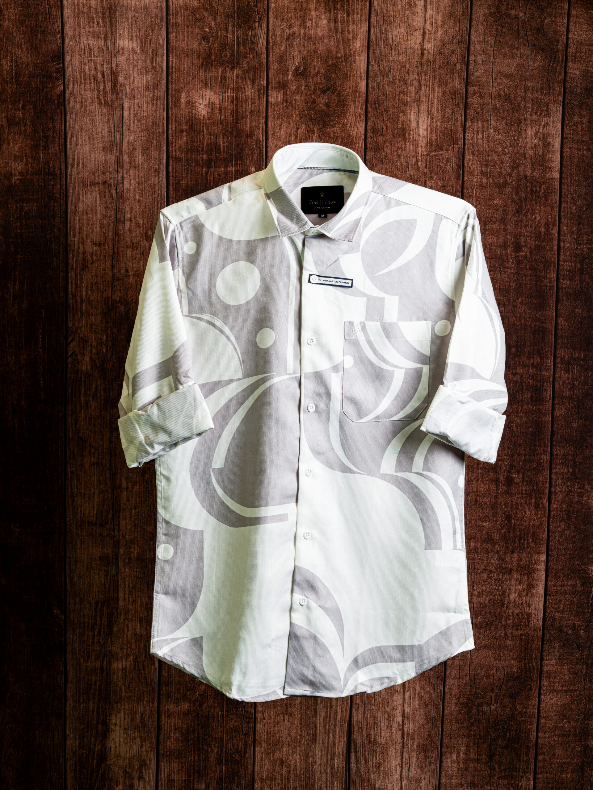 Modern Retro Liquid Swirl Cotton Shirt in premium ivory tones, crafted for smart-casual styling with standout pattern detail and all-day comfort.