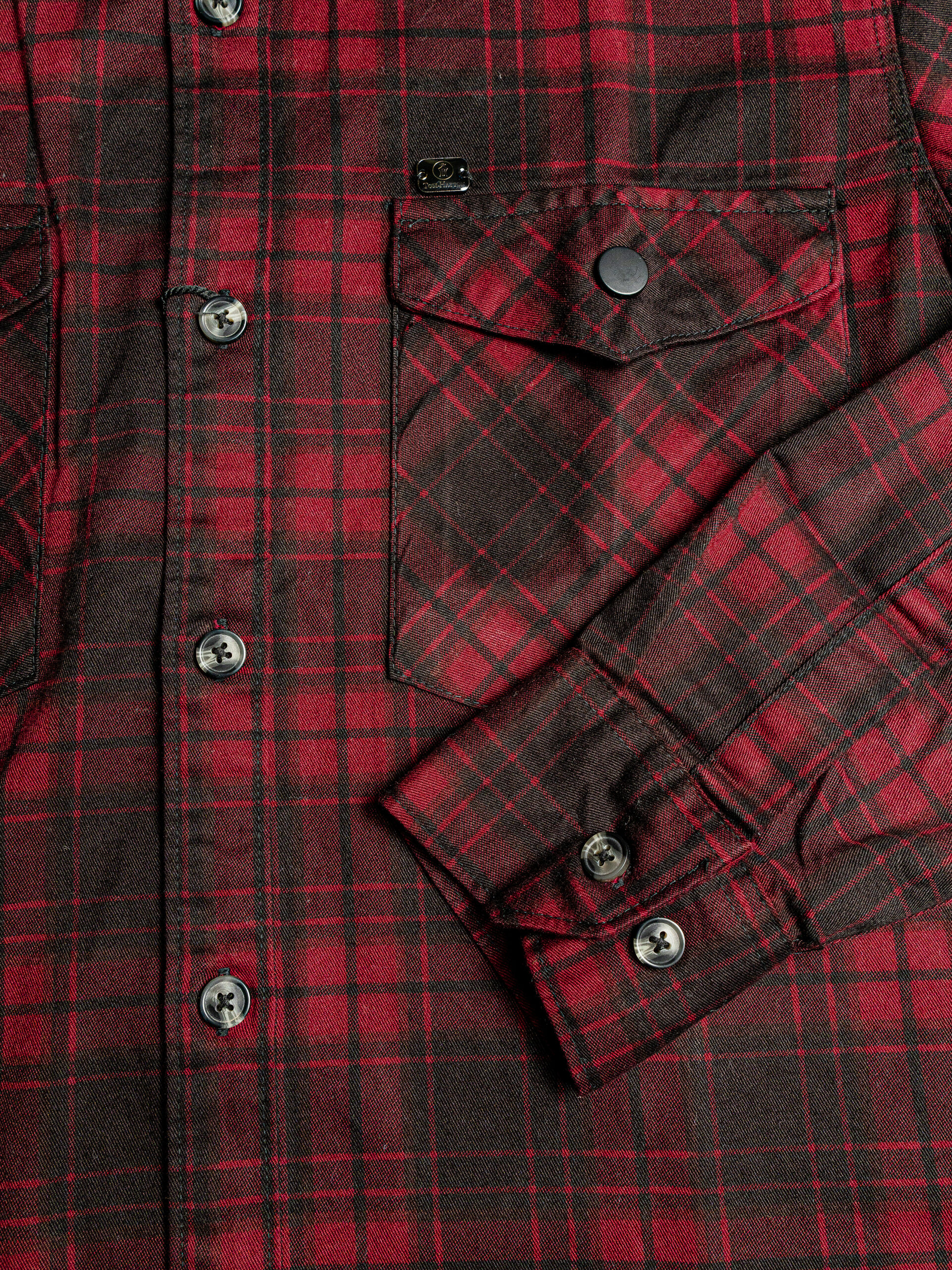 Storm Rider Graphic Red Plaid Shirt with bold motorcycle back print. Soft brushed fabric, dual flap pockets, and rugged street style.